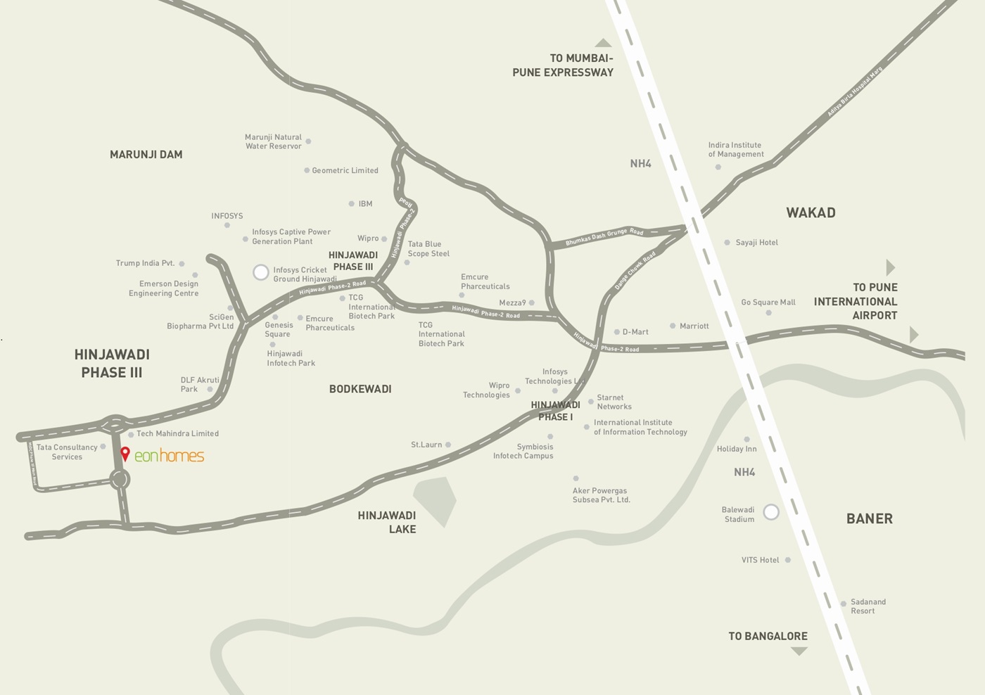 Eon Homes is located in the largest Western Suburb of Pune – Hinjawadi. Located in the proximity of almost every leading IT player in the Indian industry, Eon Homes is the perfect location for the professionals who work here. A stone’s throw will take a completely new meaning in the lives of those who work in the vicinity and you shall soon be left with a lot more time to spare at the end of a long day too. Eon Homes is easily accessible from the Mumbai Pune Expressway, through approach roads via Baner and Wakad. A short drive through the well constructed 4 & 6 lane concrete roads and the rapidly developing phases of Hinjawadi shall bring you to the Eon Homes site, right in the heart of Phase III.